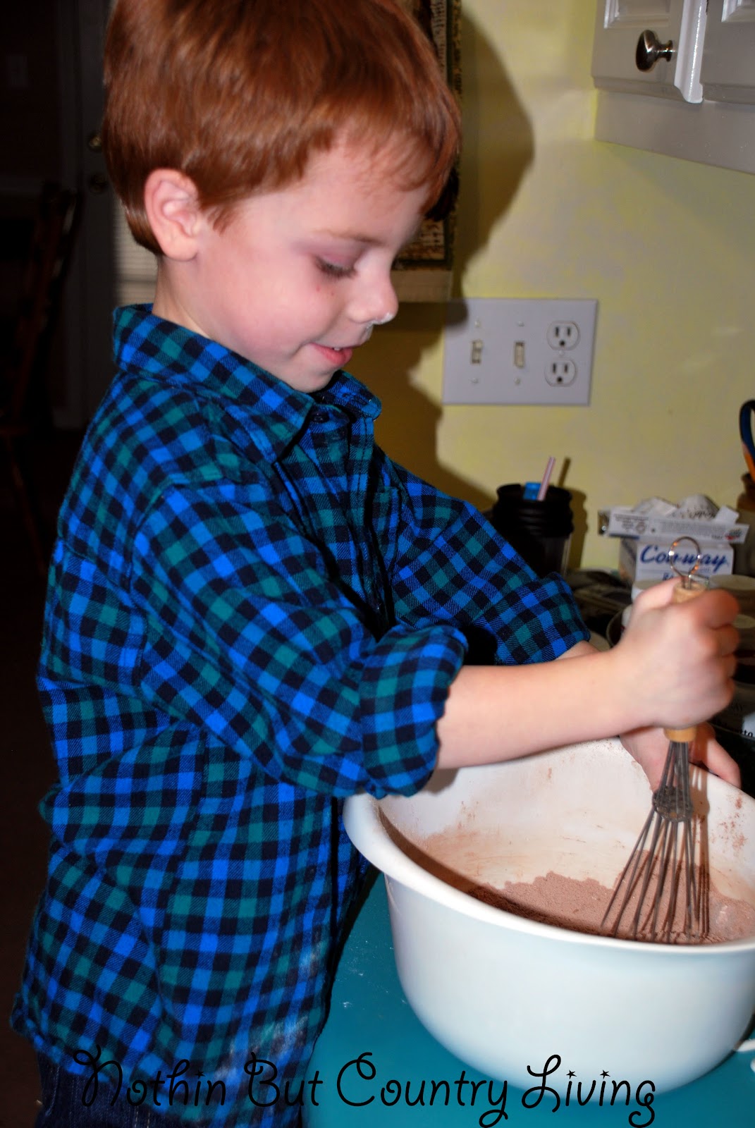 By the way did you know that last Friday was National Chocolate Cake Day.....not a better excuse to make a chocolate cake.....so when the boys arrived Friday afternoon that is what we did. Caleb was so excited...he loves to help bake and not to mention....eating anything that is chocolate.