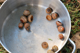 I went out today to gather acorns to make a project I found on Better Homes & Garden website. I discovered that we have been blessed with an abundance of these nuts this year, I think I know why, the acorns got to produce and mature this year (some of them are huge), because the Squirrels were so busy eating all of our peaches, apples and pears.